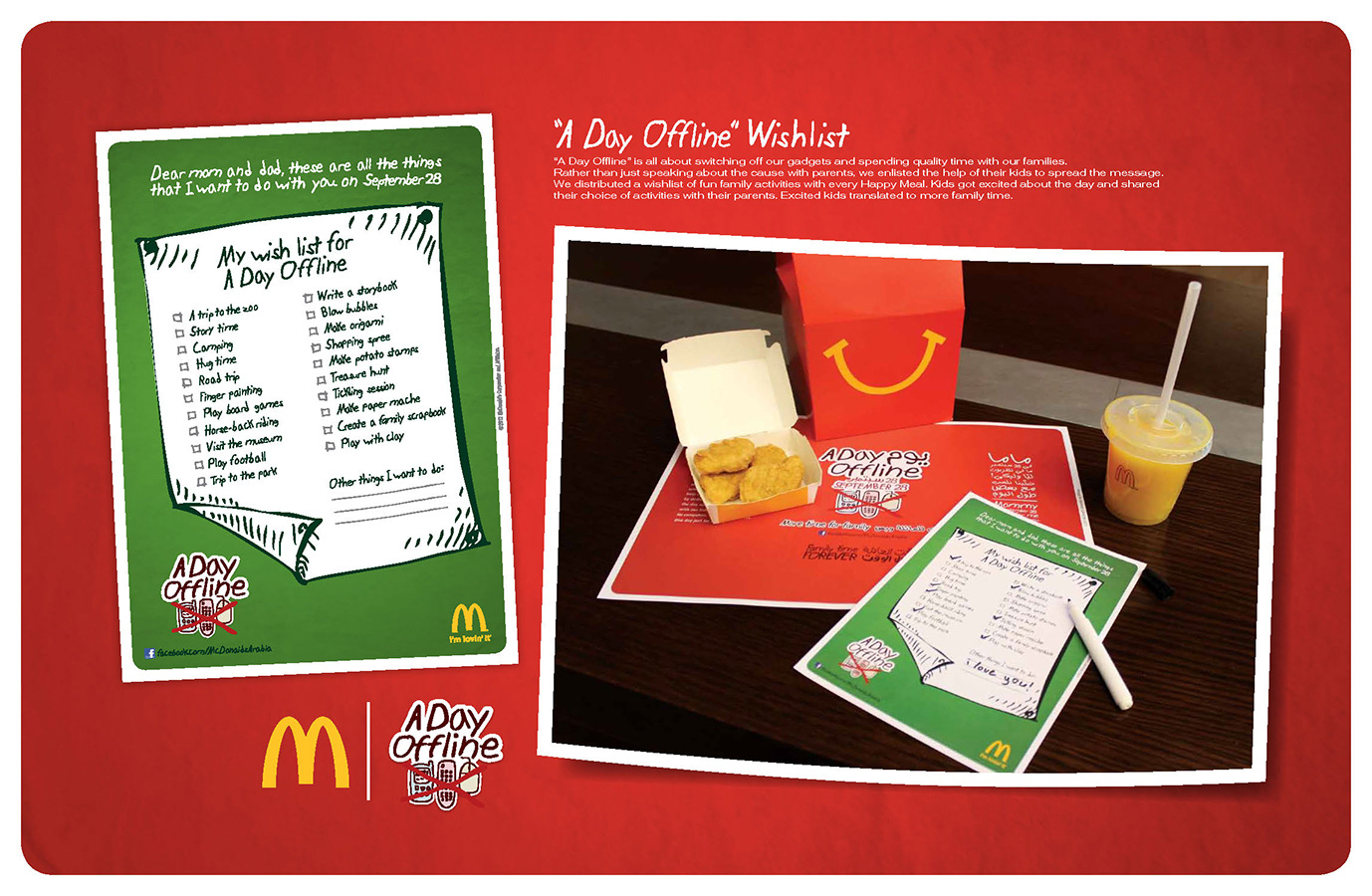 - Leo Burnett MENA - McDonald’s is and always has been a family restaurant. In order to connect with families beyond just food we wanted to bring the importance of uninterrupted family time to the forefront and create real opportunities for families to spend quality time together. So, we created a day. One day without mobiles, emails or TVs. A day dedicated to reconnecting with family – September 28. A Day Offline. Research showed 660,000 participated on the day. Additionally, PR coverage in 50+ blogs and 85 published articles extended awareness beyond the 1.79 million reached through Facebook. A month prior to the day, we started a conversation on our Facebook blog, highlighting the issue daily with content posted by leading authorities, including psychologists, teachers, and sociologists. People could share the content, suggest things to do on the day using our word cloud, and wear a Twibbon to show their support. As our print presence grew, bloggers fueled the growing debate online. On the day itself, we went into digital silence and handed out 250,000 phone vaults to lock away mobile phones for the day. Suggestions from the word cloud were converted into regional in-mall and in-store activities.